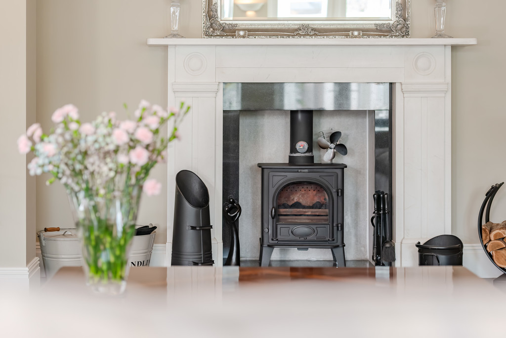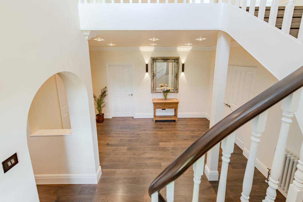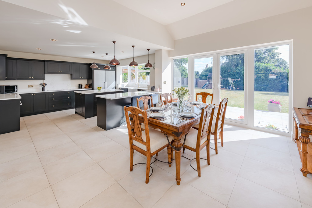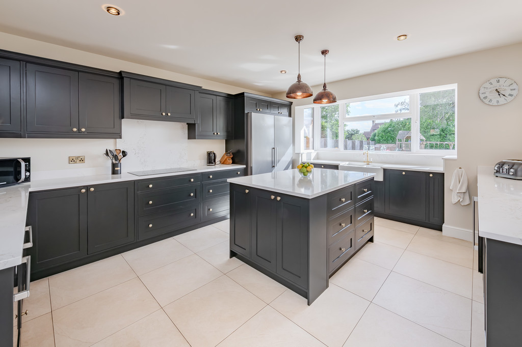 As you step into the large entrance hall, your eyes are immediately drawn to the sweeping staircase, crowned by an impressive galleried landing. Dark wood flooring flows seamlessly through to the bright sitting room, where a feature fireplace with a multi-fuel stove creates a cosy atmosphere. Glazed double doors lead to the conservatory, a perfect spot to unwind and enjoy the lovely outlook to the garden. For those requiring a dedicated workspace, there is a ground floor study with built-in bookshelves. The heart of the home is undoubtedly the wonderful kitchen. Featuring underfloor heating, this culinary haven is designed with both comfort and functionality in mind. Solid wood shaker-style units, integrated top-of-the-range appliances, and beautiful quartz worktops adorn the kitchen. It offers plenty of space for entertaining, with a large games/sitting area and an adjoining playroom with pocket doors. Double doors provide instant access to the rear garden, which enjoys a southerly aspect. Off the kitchen, there is a handy utility room with access to the side, and a coat/boot room and a stylish downstairs W.C. complete the ground floor.