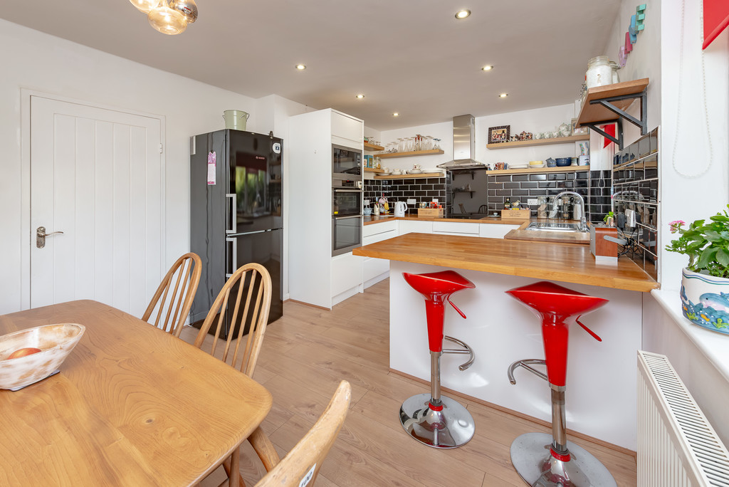The property now blends a traditional façade with a stylish contemporary interior beginning with a good-sized hall with wooden flooring, a large storage cupboard and utility room with inset sink. The wooden flooring is continued throughout the rest of the property except the kitchen and bathrooms. The principle bedroom enjoys an outlook over the rear garden and features a built-in double wardrobe and smart ensuite shower room with corner shower enclosure, basin, and W.C. There are two further double bedrooms although one could be used as a study if so required and these are served by a modern bathroom with double ended bath, shower enclosure, basin and W.C. and porcelain tiling. Oak wood effect flooring flows through the kitchen/dining room, which is fitted with a range of sleek white gloss handle less units with solid oak work tops and peninsular style breakfast bar. There are two windows to the front, making the most of the afternoon and evening sun. The lounge is another bright room with wooden flooring, wood burning stove for toasty winter evenings and patio doors overlooking the rear garden.