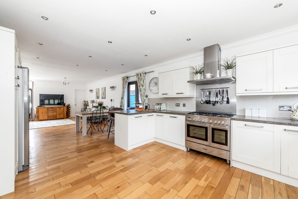 There is a spacious hall with cloakroom and oak flooring which is continued throughout the ground floor. There are two reception rooms with one to the front and one at the rear with an outlook to the patio and garden. It is however, the open plan kitchen/dining room and lounge that is the heart of the house which comprises a range of units with fitted work tops and peninsular style breakfast bar and integrated appliances to include a stainless steel range style cooker, dishwasher and fridge/freezer. There are double glazed windows to the front with double doors to the side. The lounge area stretches across the rear and is double aspect with windows to the side and double doors opening to the garden. A utility room with fitted desk area completes the ground floor. Upstairs, there are four double and one large single bedroom on the first floor with two ensuite shower rooms and a family bathroom with shower enclosure. A further staircase rises to the second floor with a fifth double bedroom and access to loft which presents scope for an additional bedroom and/or bath/shower room.